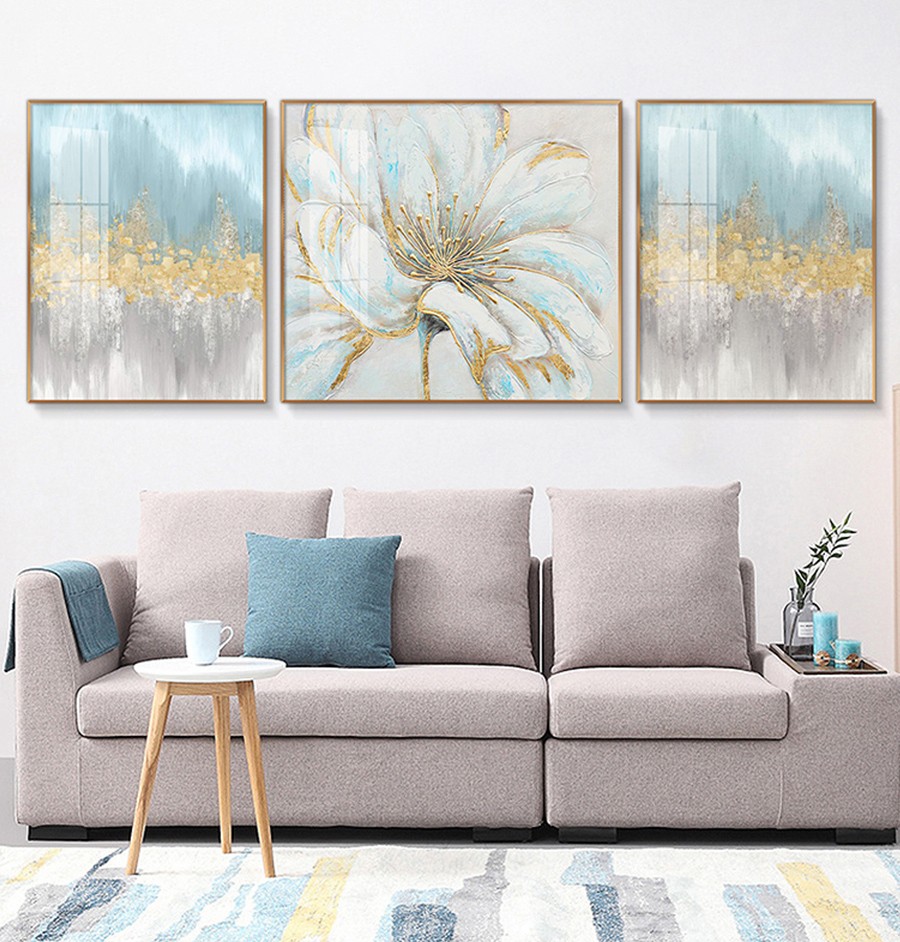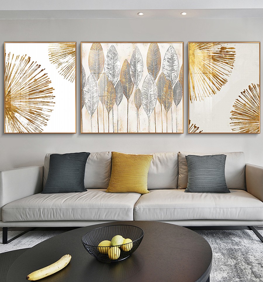 紀恒軟らかい現代軽贅沢掛画客間ソファの背景壁装飾画三連画縦版北欧簡約風テレビ壁画室内晶磁画免除打孔壁画家装壁画B-金葉流光-金色枠50*70 cm(2.5メートルぐらいのソファーに適している)