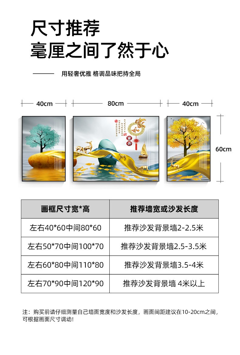 紀恒軟らかいソファーの背景壁装飾画客間壁のムーブメント現代簡単で豪華な三連晶磁器画の高級な大気抽象的な家庭装飾ソフト別荘の壁画の穴あけなし壁画A-黒い枠-錦鹿福運ぐらい40*60+中60*80(2.5ぐらいのソファーに適しています)