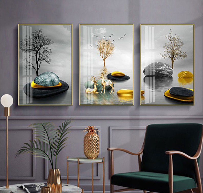飾晴画意 轻奢客厅装飾画現代単純三連画壁画墙画沙发背景墙吊るし絵レストラン画寝室麋鹿晶瓷画 杏福生活-01 40*60cm/晶瓷画